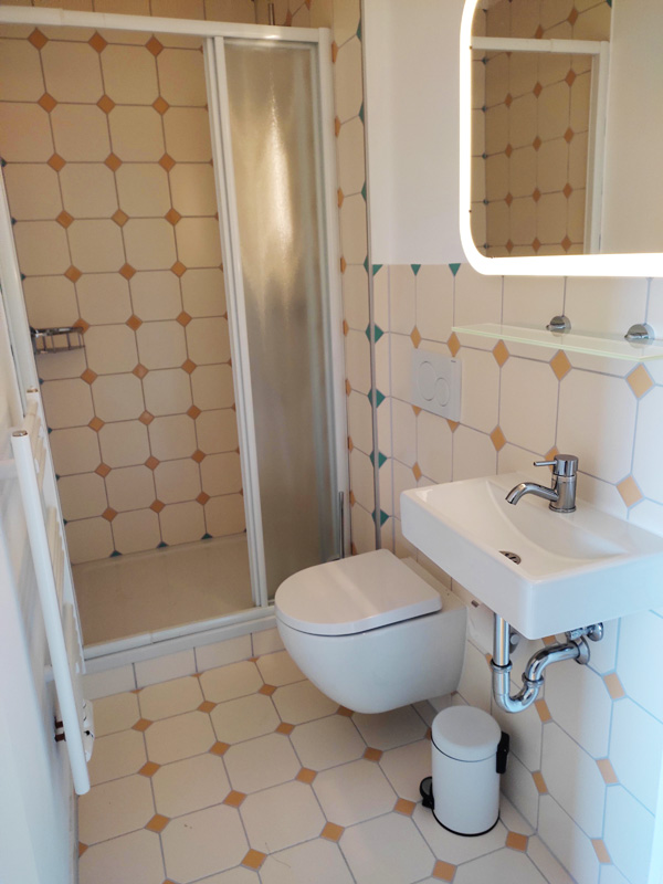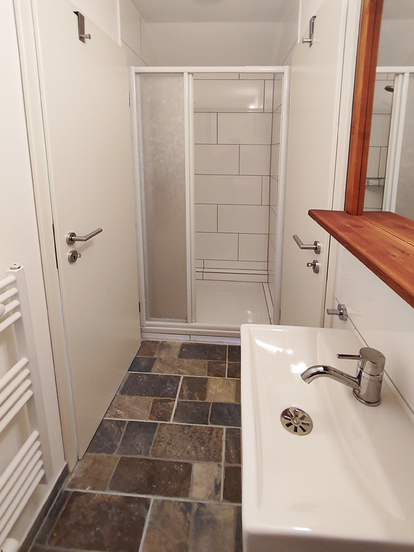 Im Entree haben Straßenschuhe und Jacken ausreichend Platz. Ebenso können hier mitgebrachte Fahrräder untergestellt und Akkus geladen werden. Unsere Treppe und die Böden im Obergeschoss sind mit biologischen Hartwachsölen behandelt. Deshalb möchten wir Sie bitten diese und den oberen Wohnbereich nur mit Hausschuhe zu betreten.