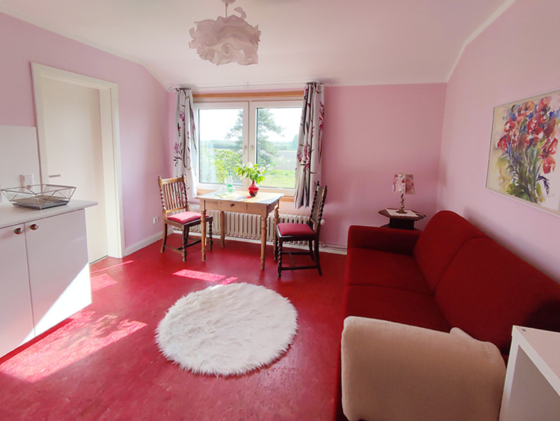 Das Rosenzimmer (Gemeinschaftsbad): ein Traum in rosa, mit Schlafcouch, kleiner Pantry Kochgelegenheit, Kühlschrank.